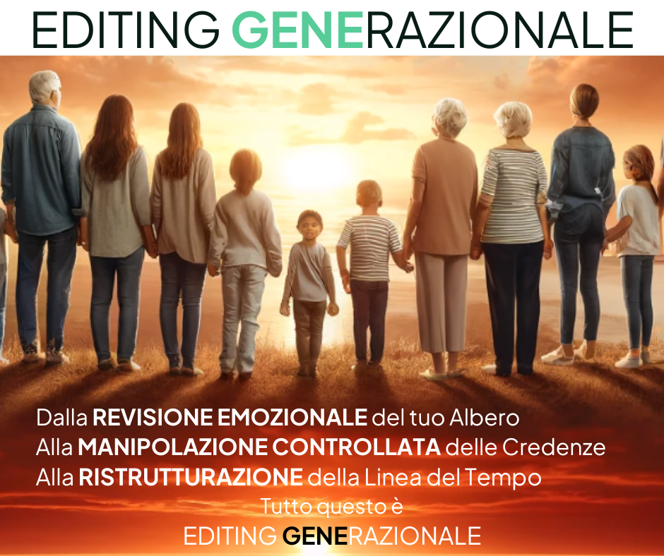 L'idea di "editing generazionale" va intesa come il processo di modificazione per influenzare non solo la tua vita futura ma anche le generazioni che verranno, attraverso azioni e decisioni prese da te proprio oggi, grazie alla “redazione” del tuo passato e di quello dell’Inconscio Generazionale. 🌳